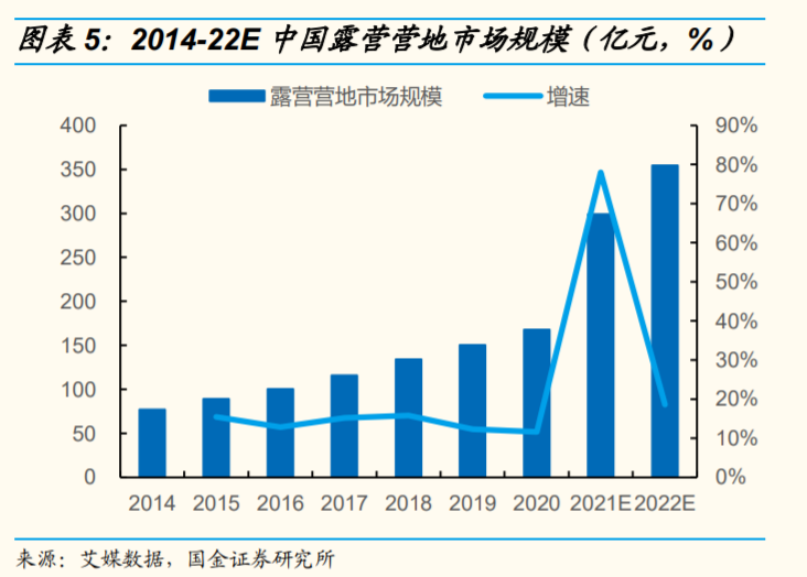 根据艾媒数据,2014-2020年我国露营营地市场规模稳健增长168亿元、年复合增速达到13.9%,21 年猛然高增78%达到299亿元,预计2022年,市场规模将突破350亿元,也就是增长回落到18.6%。