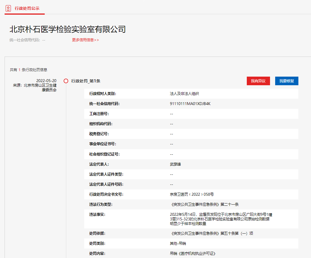 5月20日,据北京市房山区政府网站消息,北京朴石医学检验实验室有限公司被北京市房山区卫生健康委员会吊销《医疗机构执业许可证》。