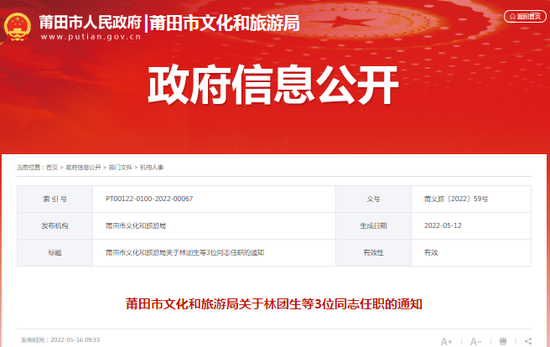 林双法同志任莆田市城厢区旅游事业发展中心主任;