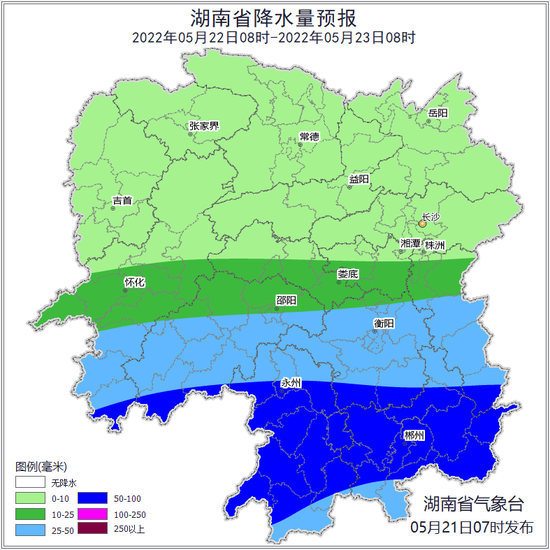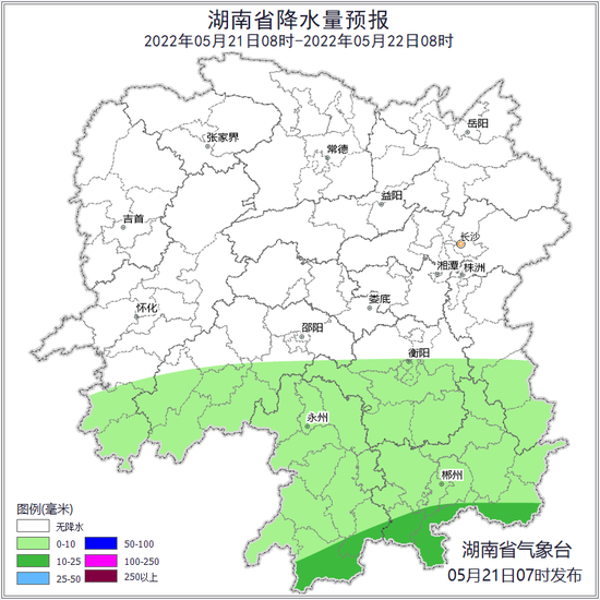 21日08时至22日08时,南部地区阴天有小到中雨,其他地区多云,22日早晨中部地区局地有雾;南风2~3级;最高气温南部地区22~24℃,其他地区24~26℃;最低气温湘西15~17℃,其他地区18~20℃。