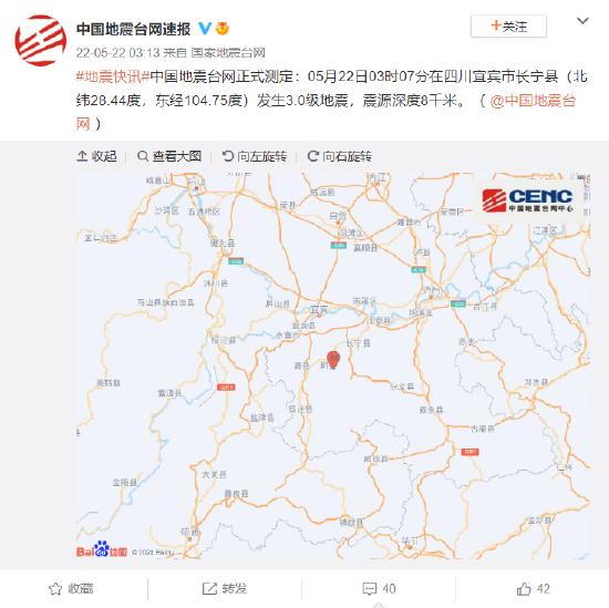 中国地震台网正式测定:05月22日03时07分在四川宜宾市长宁县(北纬28.44度,东经104.75度)发生3.0级地震,震源深度8千米。( @中国地震台网 )