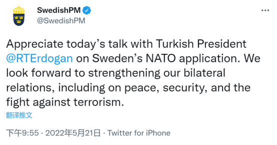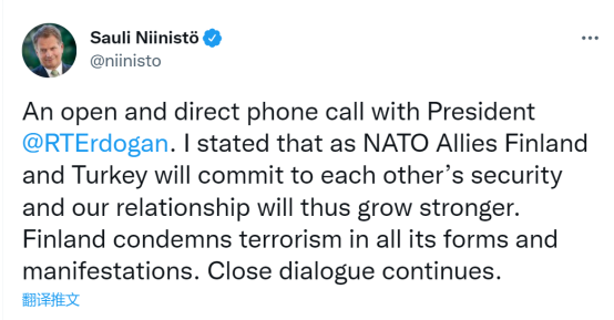尼尼斯托也在其推特账户上透露,他与埃尔多安进行了“公开和直接”的对话,“我(对他)表明,作为北约盟国,芬兰和土耳其将致力于彼此的安全,我们的关系将因此变得更加牢固。芬兰谴责一切形式和表现的恐怖主义。紧密对话还在继续。”