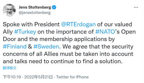 斯托尔滕贝格也在推特上透露自己与埃尔多安的通话:“我们同意,(北约)必须考虑所有盟国的安全关切,也需要继续进行对话以找到解决方案。”