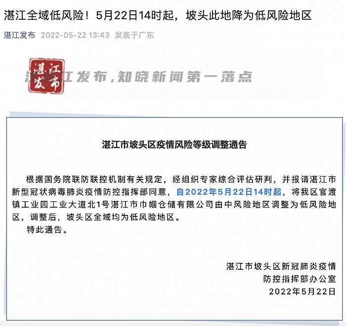 “湛江发布”微信公众号消息,湛江市坡头区新冠肺炎疫情防控指挥部办公室22日发布通告称,根据国务院联防联控机制有关规定,经组织专家综合评估研判,并报请湛江市新型冠状病毒肺炎疫情防控指挥部同意,自2022年5月22日14时起,将坡头区官渡镇工业园工业大道北1号湛江市巾帼仓储有限公司由中风险地区调整为低风险地区,调整后,坡头区全域均为低风险地区。