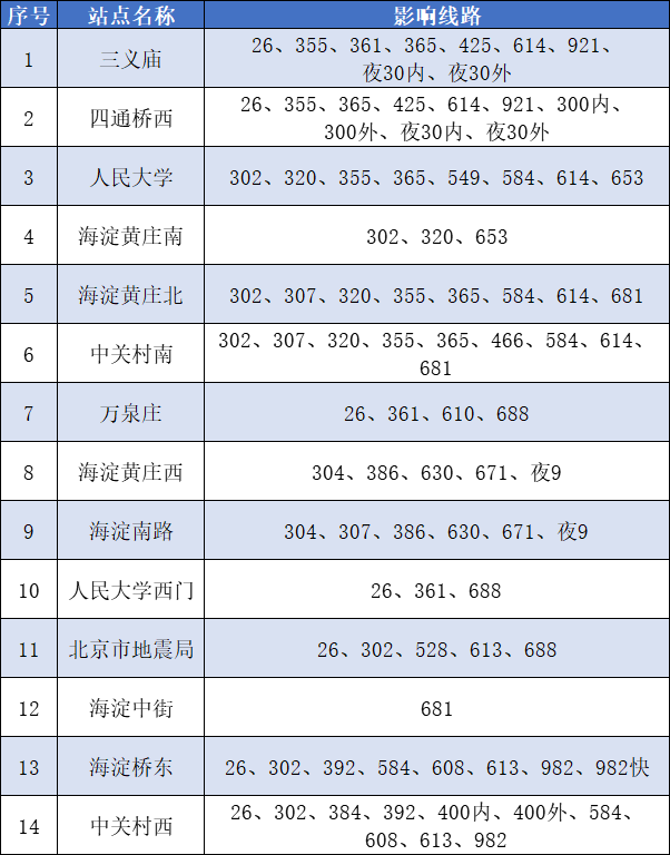 途经海淀区中关村西区及友谊社区管控区的14个站位采取甩站措施,涉及35条公交线路。