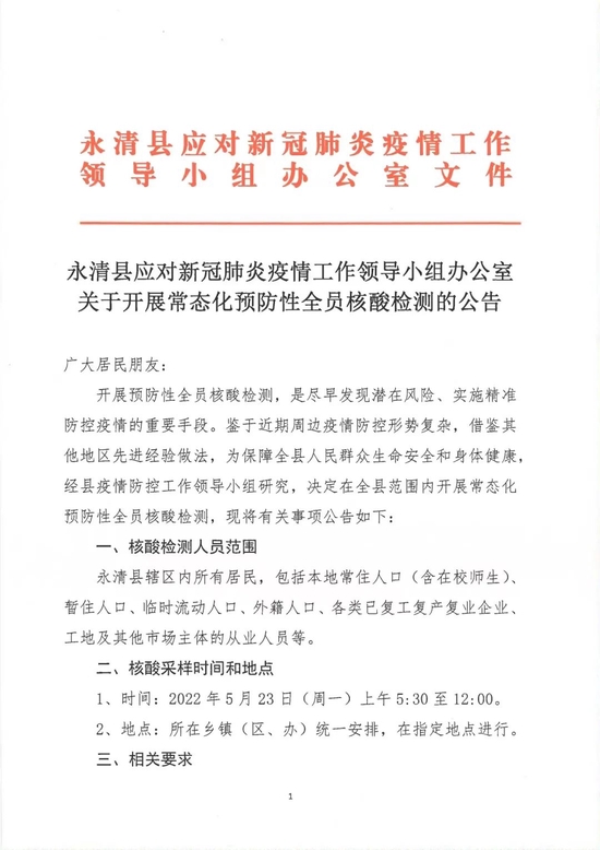 5月24日(星期二)上午5:30-12:00,西市区(燕郊镇、高楼镇、燕郊高新区、燕顺路街道、迎宾北路街道、行宫东街道、康城街道)进行全员核酸检测。地点在各属地村、社区、企业指定地点进行。