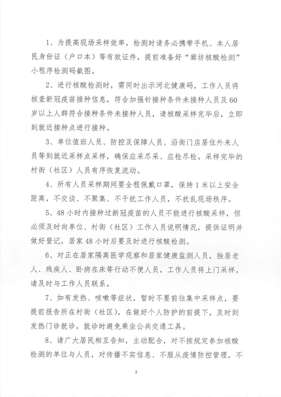 2。请密切关注本区域核酸检测时间及地点安排,按所在村(社区)通知,携带本人居民身份证等有效证件,提前准备好采样码,有序到指定地点及时主动配合做好核酸采样,确保“应检尽检、不落一户、不漏一人”。
