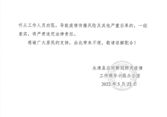 为了您和全县人民群众的健康安全,请您全力配合每周全员核酸检测筛查工作,共同筑牢我县防疫屏障,由此带来的不便,望广大居民予以理解。