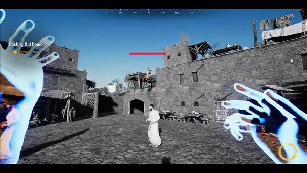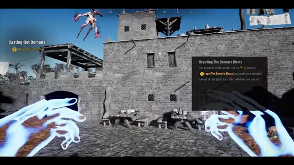从视频中可以看到,一个被恶魔附身的人在大喊大叫,耶稣施法将恶魔驱离出身体。愤怒的恶魔开始向耶稣发起攻击,耶稣必须使用神圣法术击败它。