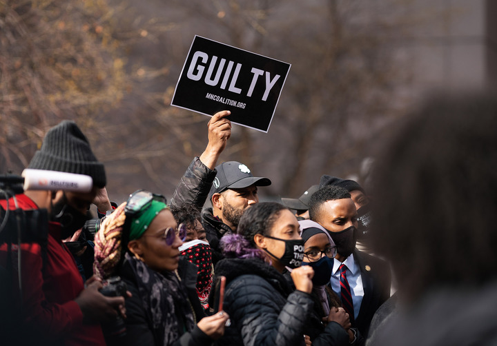 2021年4月20日,民众手举“有罪”的标语聚集在美国明尼阿波利斯市的法庭附近。新华社发(本·布鲁尔摄)