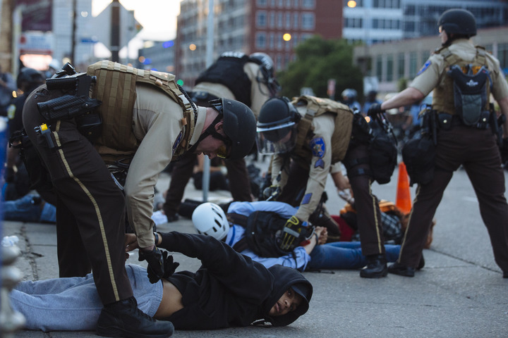2020年5月31日,抗议示威者在美国明尼苏达州明尼阿波利斯市被警察逮捕。乔治·弗洛伊德2020年5月遭白人警察暴力执法后窒息死亡,引发全美大规模抗议。新华社发(安格斯·亚历山大摄)