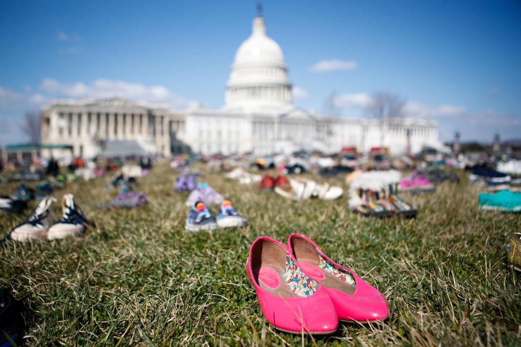 图为2018年3月13日,7000双代表自2012年美国康涅狄格州桑迪胡克小学枪击案以来枪击事件中遇难儿童的鞋子摆放在华盛顿国会山前的草坪上。人们以这种无声的方式,抗议国会面对枪击频发现状的不作为,呼吁枪支改革以保障儿童安全。新华社发(沈霆摄)