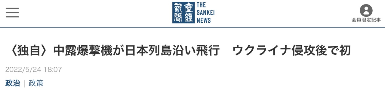 [环球网报道]中俄两军5月24日组织实施联合空中战略巡航,日本《产经新闻》当天报道称,中俄共6架轰炸机绕着日本列岛飞行。该媒体还认为,美日印澳“四方安全对话”领导人峰会24日在日本东京召开,中俄是在采取联合行动进行对抗。