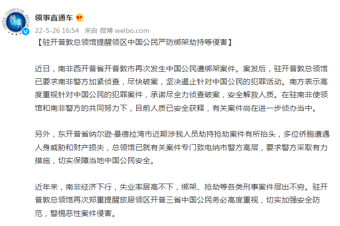 近年来,南非经济下行,失业率居高不下,绑架、抢劫等各类刑事案件层出不穷。驻开普敦总领馆再次郑重提醒旅居领区开普三省中国公民务必高度重视,切实加强安全防范,警惕恶性案件侵害。