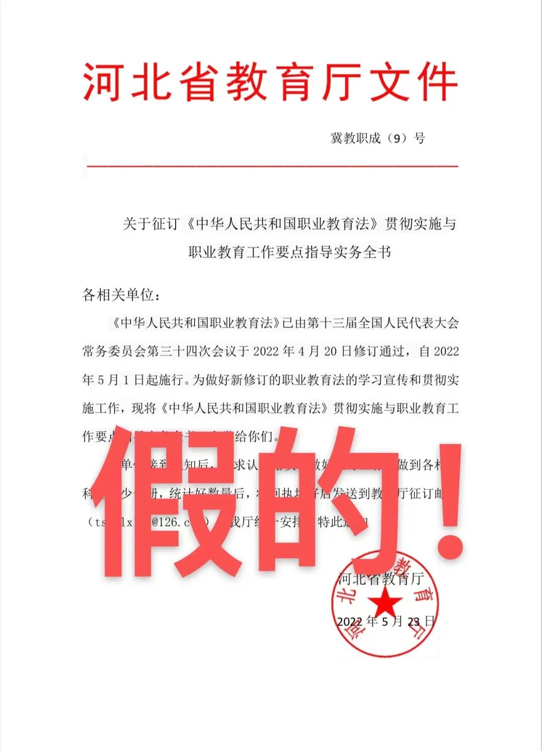 日前,河北省教育厅接到学校举报,有不法分子以河北省教育厅名义,诈骗征订(《中华人民共和国职业教育法》贯彻实施与职业教育工作要点指导实务全书)。现省教育厅郑重承诺,从未布置此项图书征订工作,也不会以任何方式征订此类图书。