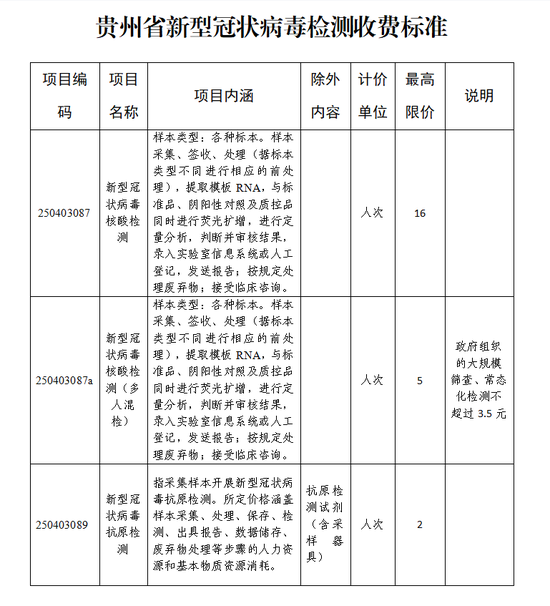日前,贵州省医疗保障局等四部门下发调整新型冠状病毒核酸检测项目和抗原检测项目收费标准的通知。疾控检测机构、医疗机构开展新冠病毒核酸检测项目最高收费标准调整为16元/人次(含检测试剂);多人混检最高收费标准调整为5元/人次(含检测试剂),大规模筛查时不高于3.5元/人次(含检测试剂)。疾控检测机构、公立医疗机构开展新冠病毒抗原检测项目最高收费标准调整为2元/人次,包含试剂的总费用不高于6元。通知自2022年5月30日执行。