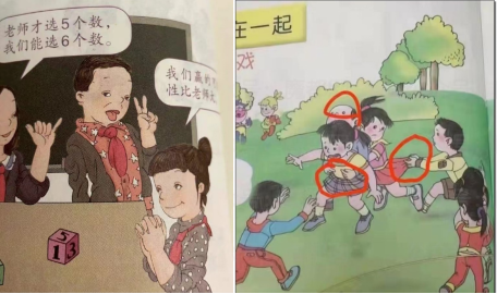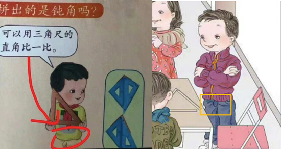 问题是,网友抱怨的不仅是教材插画里的小朋友有些“丑”,而且还有一些疑似色情的“擦边球”。