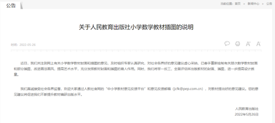 对此,人民教育出版社(以下简称“人教社”)昨天(5月26日)发布说明表示,已着手重新绘制有关册次数学教材封面和部分插图。