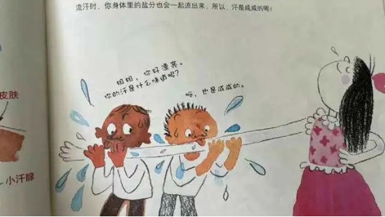 原来,网友发现,在江苏凤凰少年儿童出版社出版的一本《流汗啦》绘本中,两个男生双手抱着女生的手臂,伸出舌头舔着。男生一边舔着手臂,一边说:“姐姐,你好漂亮,你的汗是什么味道呢?”另一个男生说:“呃,也是咸咸的。”