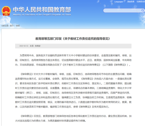 《指导意见》针对大中小学教材编写、审核、出版、印制发行、选用使用等各环节存在的主要责任问题,明确追责情形和处理方式。《指导意见》强调,要严肃追究问责,明确教材工作责任承担主体和追责处理方式,强调建立分工负责、协调配合的工作机制。