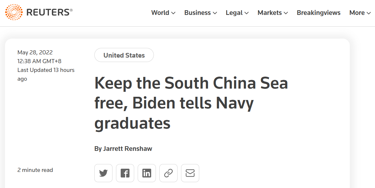 路透社称,刚从亚洲回来的拜登还声称,印太海上战区将成为美国应对当地自然灾害和人道主义灾难的“前沿”,“你们将捍卫国际航行准则,为自由开放的印太提供保障,确保南海及其他地区的航行自由,确保海上航道保持安全和开放。”