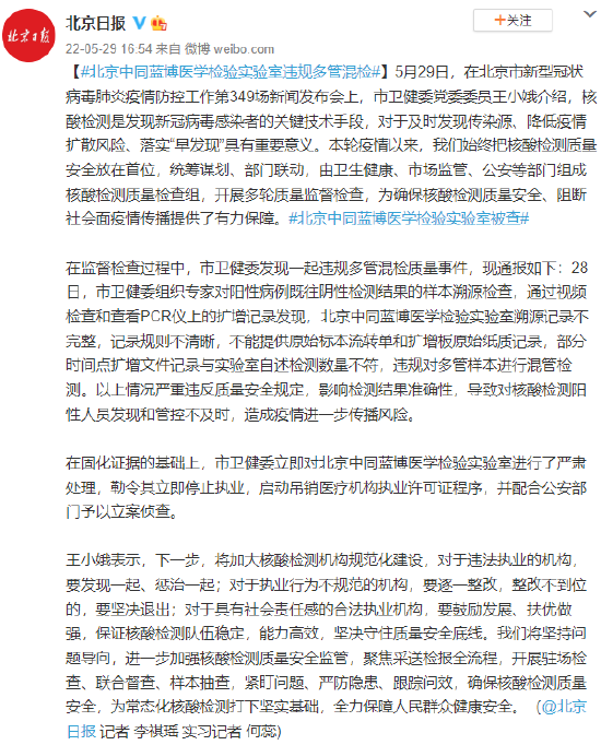 在监督检查过程中,市卫健委发现一起违规多管混检质量事件,现通报如下:28日,市卫健委组织专家对阳性病例既往阴性检测结果的样本溯源检查,通过视频检查和查看PCR仪上的扩增记录发现,北京中同蓝博医学检验实验室溯源记录不完整,记录规则不清晰,不能提供原始标本流转单和扩增板原始纸质记录,部分时间点扩增文件记录与实验室自述检测数量不符,违规对多管样本进行混管检测。以上情况严重违反质量安全规定,影响检测结果准确性,导致对核酸检测阳性人员发现和管控不及时,造成疫情进一步传播风险。