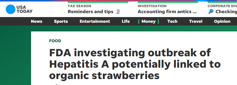 美国多州暴发甲肝疫情,或与有机草莓有关,美食药监局及美疾控中心均介入调查。(美媒报道截图)