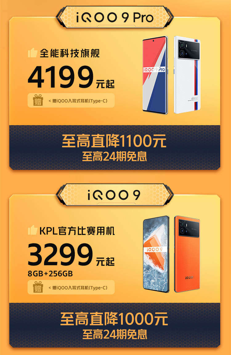 iQOO 9则是游戏高玩的首选,堪称安卓最佳直屏旗舰,在骁龙8 Gen 1以及独显芯片Pro的加持下,游戏性能突出,并且还带来了全感操控系统,可以全方位提升游戏体验。活动期间,iQOO 9同样支持至高24期免息以及赠送iQOO入耳式耳机(Type-C),最高直降1000元,售价3299元起。