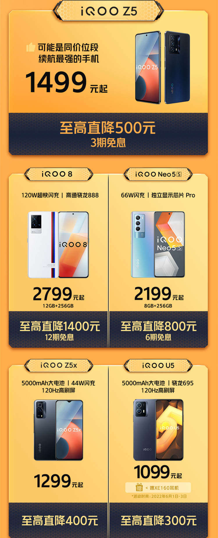 iQOO 8、iQOO Neo5S、iQOO Z5x、iQOO U5等老机型也参与到了此次活动中,每款机型均有直降优惠,其中iQOO 8至高直降1400元,可能是iQOO史上最大的直降力度。值得一提的是,用户在购机时可在价保规则范围内申请一键价保,让自己买得更安心。此外,iQOO还有爆款手机五折秒杀、iQOO各大官方店铺至高1000元大额神券免费抢等福利。面对这么丰厚的购机福利,只能说心动不如行动了。