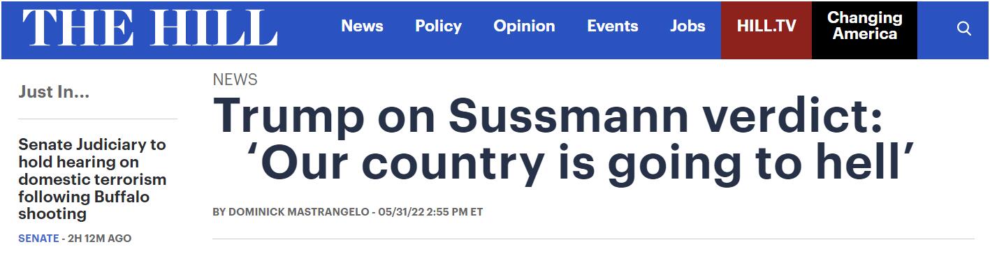 据美国《国会山报》报道,特朗普当天在社交平台上发文称,“我们的法律体系腐败,我们的法官(和司法)党派偏见严重,(他们趋于)妥协或只是害怕,我们的边境开放,我们的选举被操纵,通货膨胀猖獗,天然气价格和食品价格‘飞涨’,我们的军事‘领导人’被唤醒,我们的国家正走向地狱,而迈克尔·苏斯曼是无罪的。”