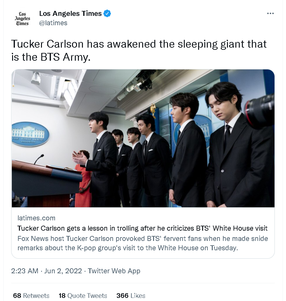 这一幕也直接引起了拜登的支持者,或是那些讨厌美国保守派政治势力的人以及那些讨厌卡尔森的美国网民乃至媒体的兴奋,因为这些人也十分清楚“防弹少年团”等韩国偶像团体的粉丝的战斗力。