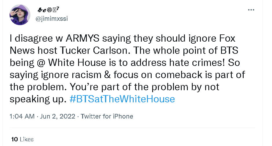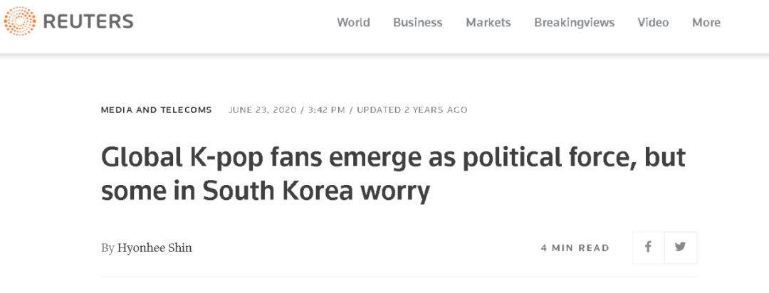 英国路透社2年前的一篇报道亦曾指出,“防弹少年团”在韩国的粉丝并不希望他们卷入到美国国内的政治斗争中,认为这不利于团体的发展,甚至会带来反噬。