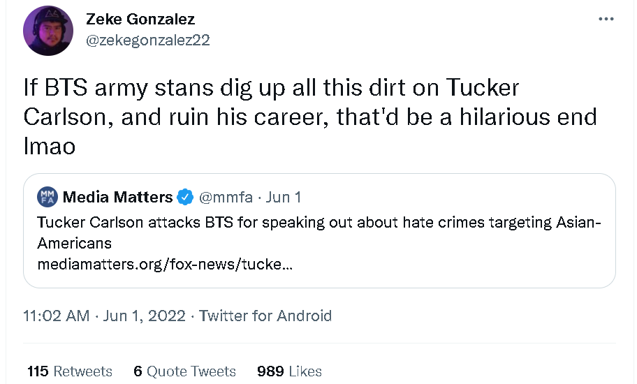 如下图所示,这类美国网民和媒体不仅对卡尔森得罪“防弹少年团”粉丝的事情感到幸灾乐祸,甚至还在进一步煽动这些粉丝团体去“冲”他。