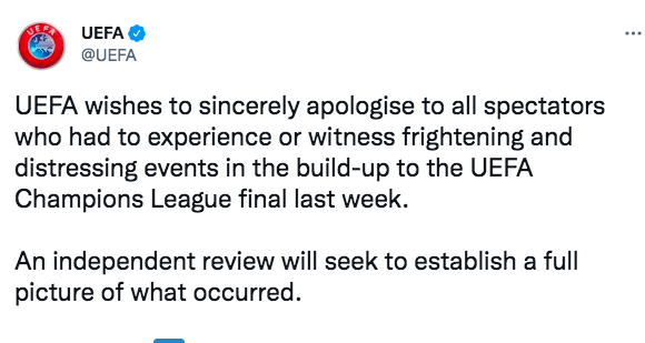 欧足联于当地时间本周五在官方声明中称,“谨向所有在2022年5月28日巴黎法兰西体育场举行的欧冠决赛筹备过程中,经历或目睹过令人恐惧和痛苦事件的观众致歉”“任何球迷都不应被置于如此境地”。欧足联还表示,事件发生后,已委托葡萄牙前教育部长蒂亚戈·布兰登奥·罗德里格斯领导进行独立调查,“调查将寻求确定当天在体育场内和周边发生的事件全貌以及时间表,包括检查通过各入口进入体育场的观众流量”。