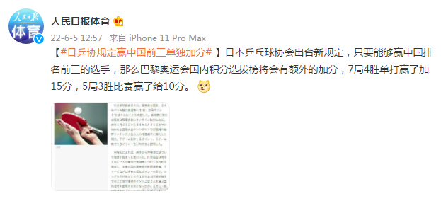 日本乒乓球协会出台新规定,只要能够赢中国排名前三的选手,那么巴黎奥运会国内积分选拔榜将会有额外的加分,7局4胜单打赢了加15分,5局3胜比赛赢了给10分。