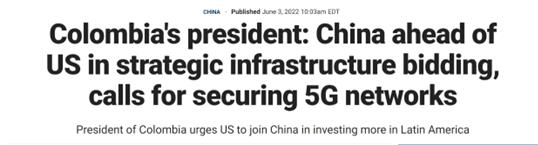 【环球网报道 记者 张晓雅】“哥伦比亚总统:中国在战略基础设施竞标中领先于美国,呼吁确保5G网络安全”,美国福克斯新闻网当地时间3日以此为题报道对哥伦比亚总统杜克的独家专访。报道说,杜克鼓励美国与中国一道加强在拉丁美洲的战略基础设施竞标,他对比称,美国在这一方面远远落后于中国,并明确表示,“不认为”中国在拉美投资是一种“威胁”。