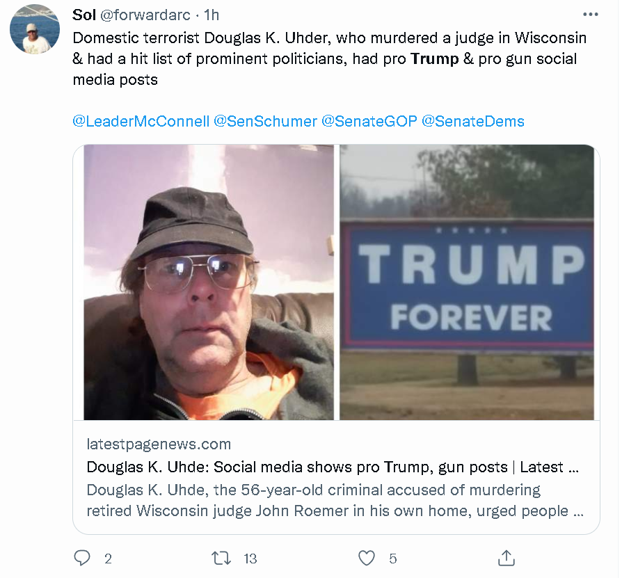 而从认识乌达的朋友的描述来看,此人的人生相当不如意。因为一直在坐牢,所以50多岁了仍然单身,也没有孩子,生活相当孤僻。同时,这些友人亦表示他确实是特朗普的铁杆支持者。但他们对于他会杀人都感到意外,称他此前从未展现出想杀人的意愿,是个老实人。