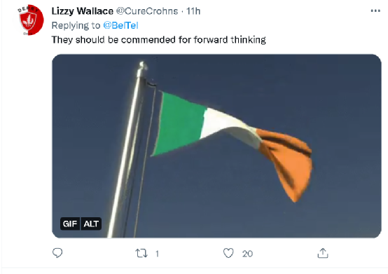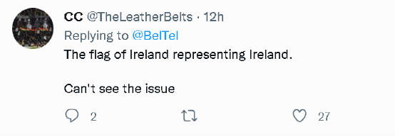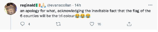 如下图所示,有的网民就表示,用爱尔兰的旗帜代表爱尔兰没错呀。有的人还补充说,北爱尔兰可是有一半人认爱尔兰的三色旗的。还有的人表示,北爱尔兰六郡的旗帜最终都会变成三色旗,BBC不过是承认了这个事实,预见了那个未来。