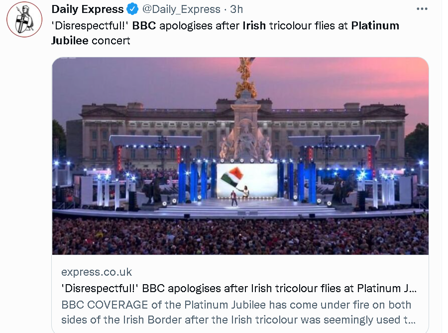 据英国北爱尔兰《贝尔法斯特电讯报》5日报道,在本周末举行的英国女王伊丽莎白二世登基70周年的庆典上,英国广播公司(BBC)出现了严重的播出事故,竟用爱尔兰共和国的三色国旗代表了英国的北爱尔兰地区。