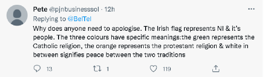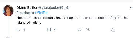 而下图这位来自北爱尔兰的网民更表示,北爱尔兰并没有真正属于自己的旗子,爱尔兰的三色旗才是正确的旗子。