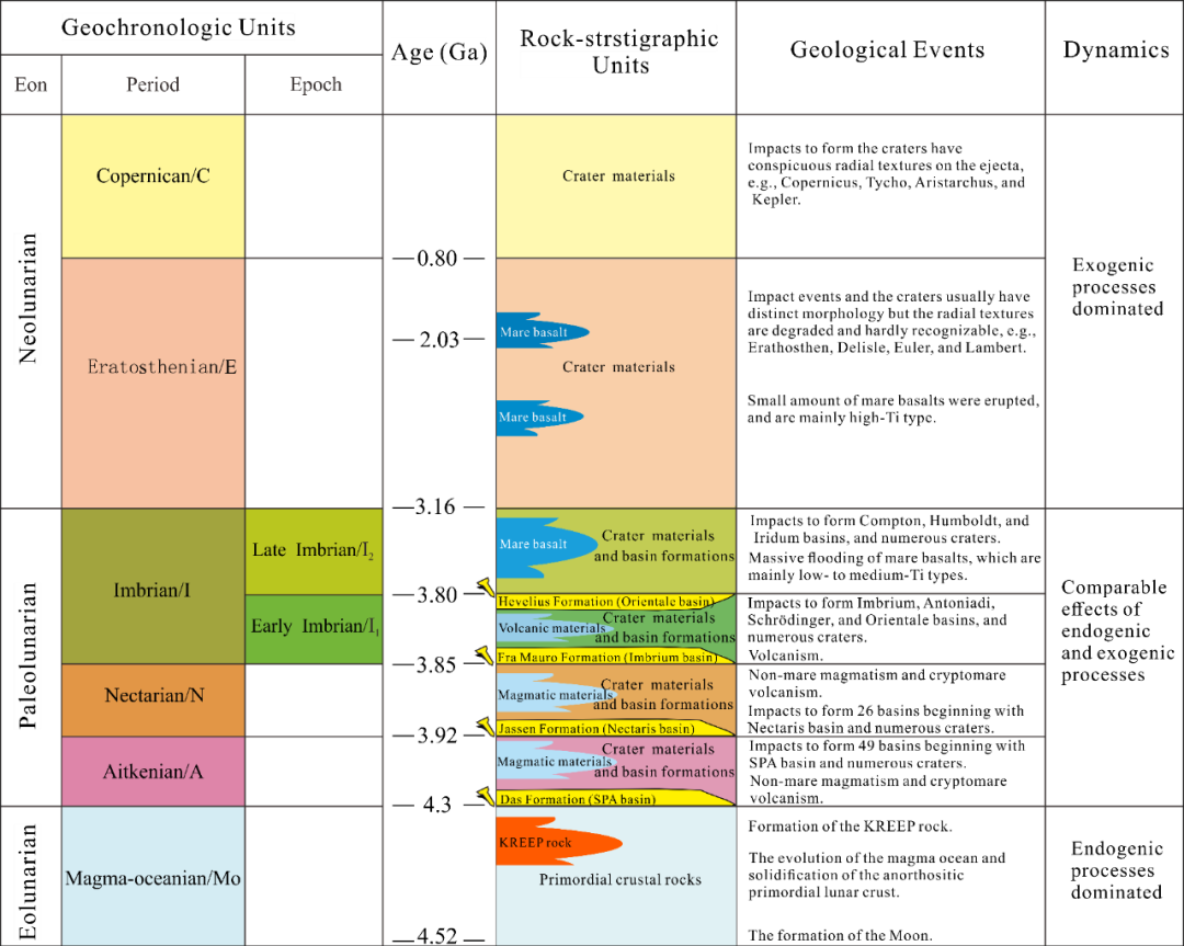 在新编制的月球地质图中,基于对月球动力学演化过程的认识更新了月球地质年表,采用“三宙六纪”的划分方案,将月面历史分为三个宙,分别为冥月宙、古月宙和新月宙,与月球演化过程中的内动力地质作用为主的阶段、内外动力地质作用并重阶段以及外动力地质作用为主的阶段相对应。