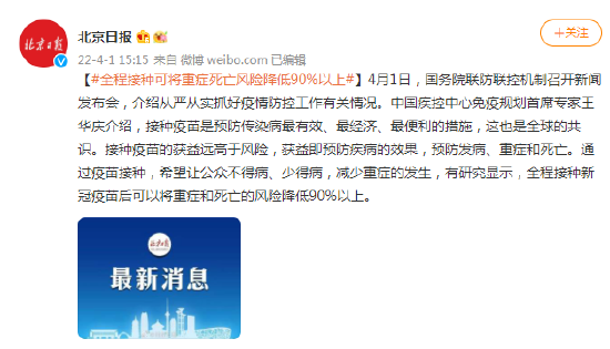 4月1日,国务院联防联控机制召开新闻发布会,介绍从严从实抓好疫情防控工作有关情况。中国疾控中心免疫规划首席专家王华庆介绍,接种疫苗是预防传染病最有效、最经济、最便利的措施,这也是全球的共识。接种疫苗的获益远高于风险,获益即预防疾病的效果,预防发病、重症和死亡。通过疫苗接种,希望让公众不得病、少得病,减少重症的发生,有研究显示,全程接种新冠疫苗后可以将重症和死亡的风险降低90%以上。