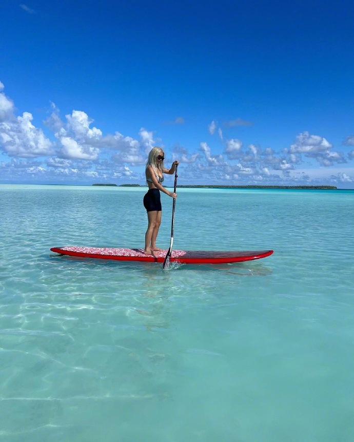 金卡戴珊与男友皮特海岛度假分享美照,穿比基尼秀优越身材,在海边划船享受假期。