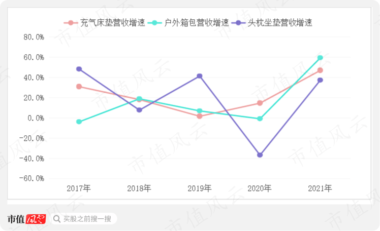 另外公司营收占比最大的产品为充气床垫,产品结构相对单一,需要关注其他单品的放量情况,且公司缺乏自有品牌支撑,在当前国内“露营热”的背景下,境内市场受益并不明显。