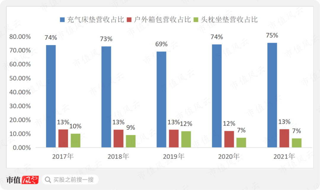 公司目前营收占比最大的产品是充气床垫,2021年充气床垫营收占比75%,其次是户外箱包,营收占比13%。