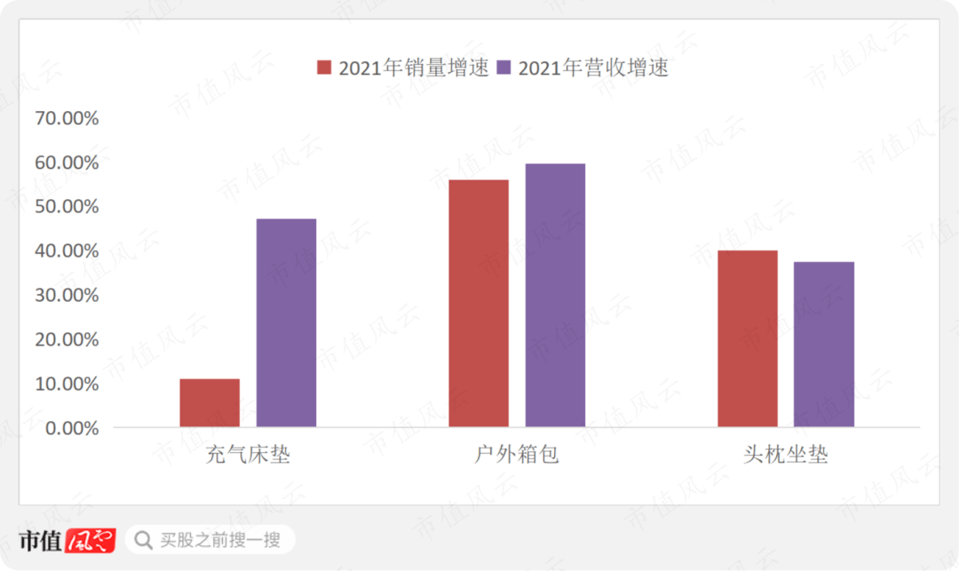 公司营收占比最大的产品充气床垫,2018年至2021年,平均单价不断提升,其中2021年提价幅度高达32.5%,产品销量近两年持续增长,整体呈现量价齐升的态势。
