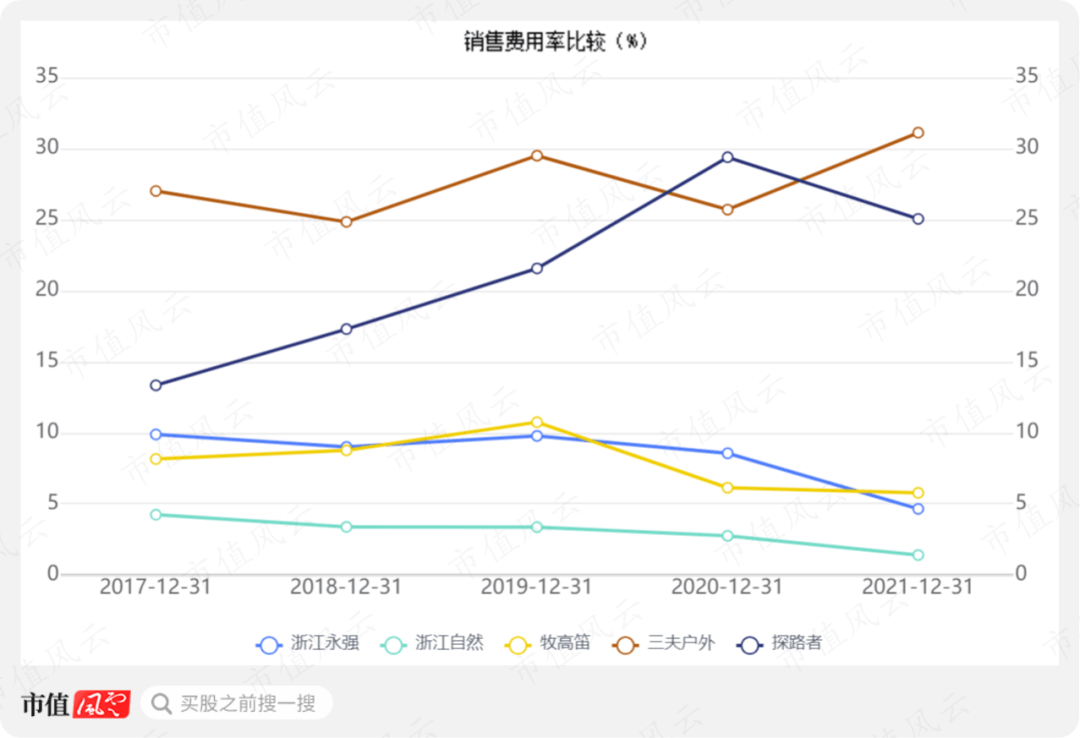 对比户外用品行业其他上市公司,公司的期间费用率基本处在最低水平,对净利率的影响较大。