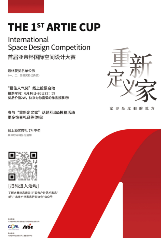 由广东省户外家具行业协会、亚帝Artie主办,墨鱼设计学院协办的首届亚帝杯国际空间设计大赛自1月1日正式启动。截止1月28日,大赛收到来自200多所高校、100多家设计公司以及自由设计师等投递的524组有效报名信息。2月28日至3月4日,评审专家组评定出40份入围作品。3月6日,终审评选工作启动,大赛特别邀请到权威学术专家和业内知名人士组成评审团,评选出一、二、三等奖以及优秀奖共10名。大赛颁奖典礼现定于7月中旬线上举办,具体时间将另行通知。