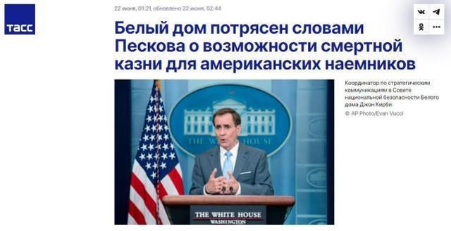 当被问及美方是否认为,佩斯科夫的上述言论是在向美国总统拜登发出一种信号,即有关在乌克兰战场如何利用美国公民的一种信号时,柯比回答说:“不论他们在这里所说的是否是其真实的意思,即可能会面临这种结局(死刑),他们可以利用两名在乌克兰战斗的美国人的死刑判决,还是他们只是觉得那是一个负责任的大国可以做的事——来谈论他们可以这样做(判死刑),以此来向美国总统和美国人民发出信号,这两种情况同样令人担忧。这就是我们对此感到震惊的原因。”