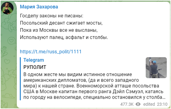 发布关于俄内政外交消息的账户“РУПОЛИТ”21日在Telegram上发帖称,“我们通过一个手势就能看出美国外交官(以及整个西方)对我们国家的真实态度。美驻俄大使馆海军武官、上校戴尔·塞缪尔在莫斯科骑自行车出行期间,停在一个印有字母‘Z’的柱子旁,并竖中指拍照。通常情况下,戴尔·塞缪尔应与俄军事部门相互协作,而不是直接违反俄法律法规。我们在此处看到的是直接应按《俄联邦刑法典》第280条第3款进行处罚的行为”。